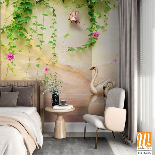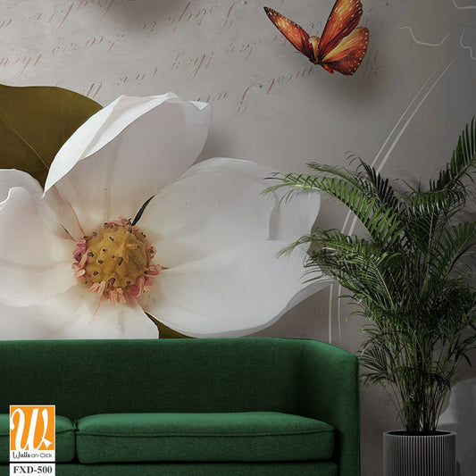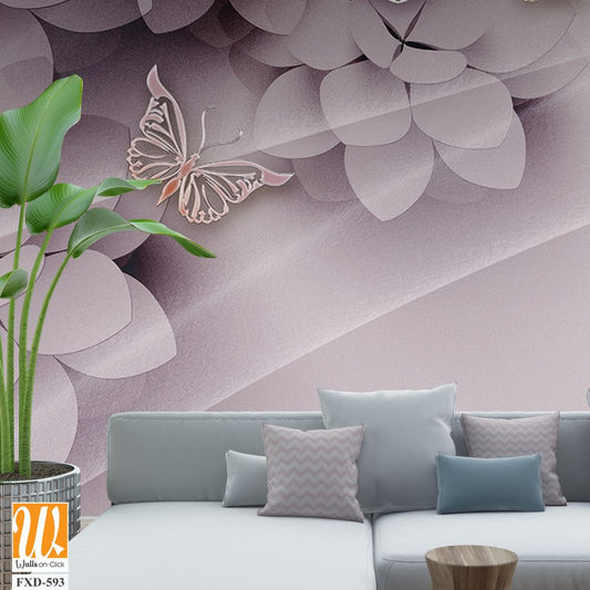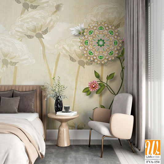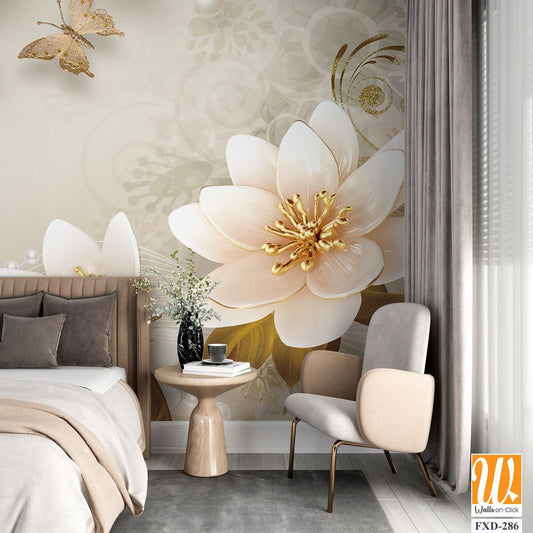 3D floral mural with beautiful flowers, pearls, and butterflies Wallpaper [WP-FXD-286]