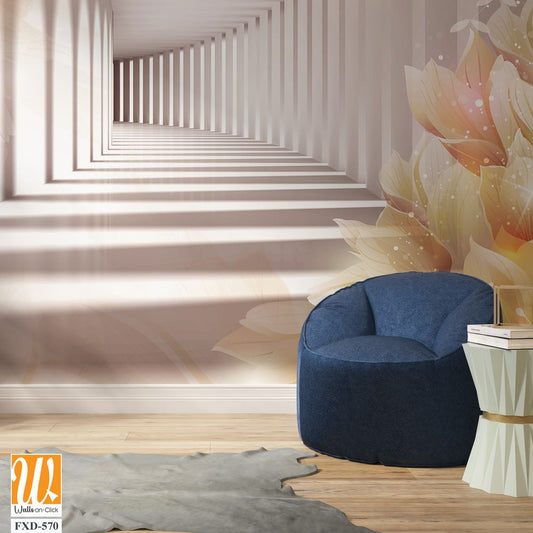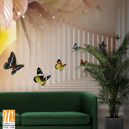 3D wallpaper, white corridor with flowers and butterflies [WP-FXC-108]