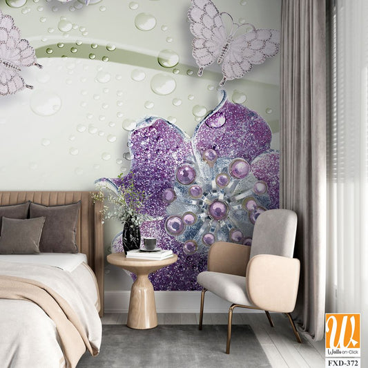 3D wallpaper with purple flowers, silver pearls, and butterflies [WP-FXD-372]