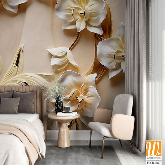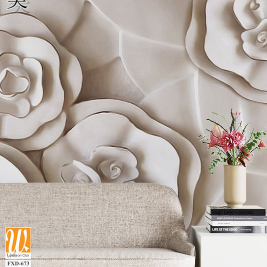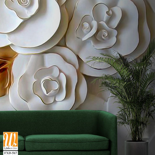 3D carved white roses wall mural Wallpaper [WP-FXD-567]