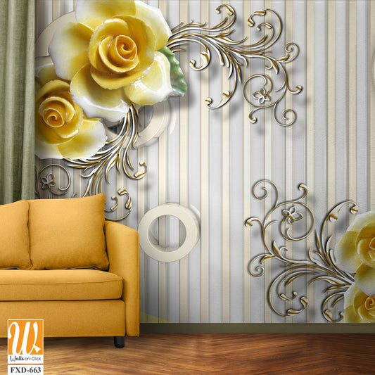 3D yellow roses and silver circles on a striped background Wallpaper [WP-FXD-663]