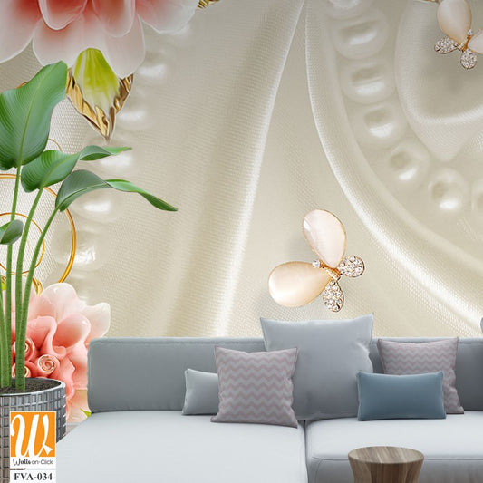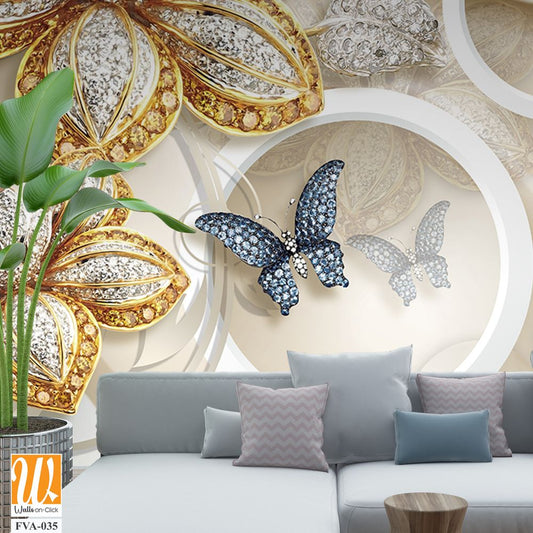 3D wallpaper with beautiful golden and silver flowers, butterflies [WP-FVA-035]
