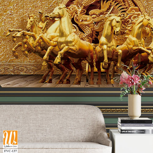 Golden decoration with 7 horses sculpture Wallpaper [WP-FVC-137]