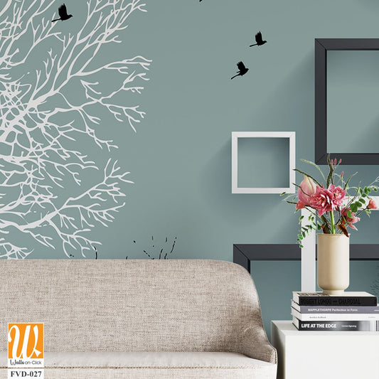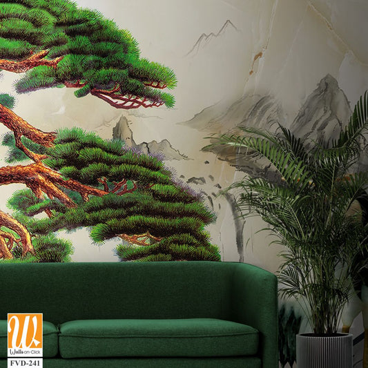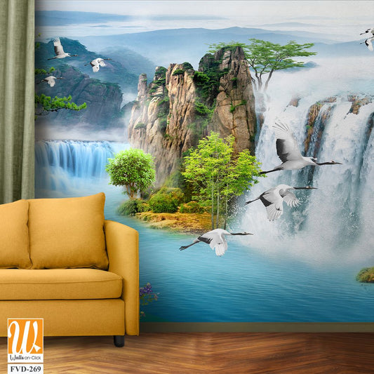 Mural depicting cranes on a mountain, with pine trees [WP-FVD-241]