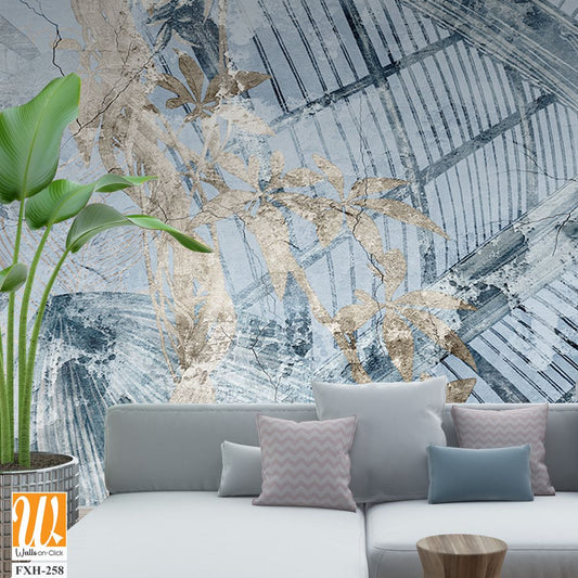 Abstract botanical background. Graphic illustration of a greenhouse. Floral wallpaper with exotic jungle leaves. Blue colors. Exotic flora. Illustration for photo wallpaper, wallpaper, mural, card. [WP-FXH-258]