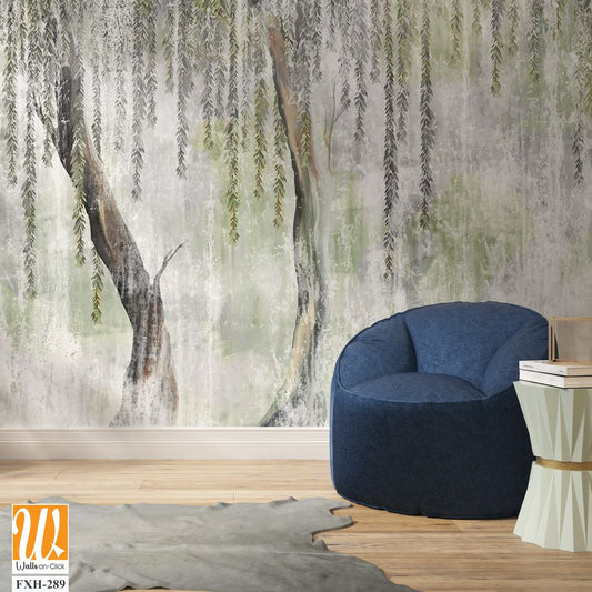 A textured background with white scuffs on which painted trees are visible, tree trunks from which leaves hang, photo wallpaper [WP-FXH-289]