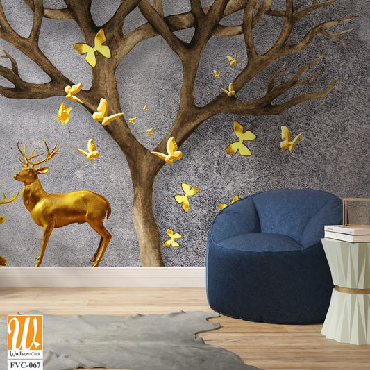 3D deer and tree with yellow butterflies Wallpaper [WP-FVC-067]