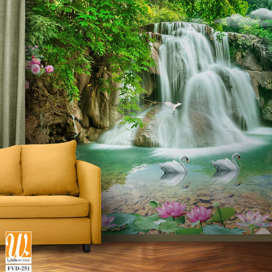 3D wallpaper featuring waterfalls and lotuses in a pond [WP-FVD-251]