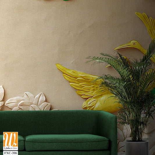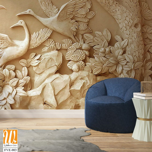 3D carved relief wall of two cranes Wallpaper [WP-FXC-306]