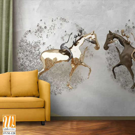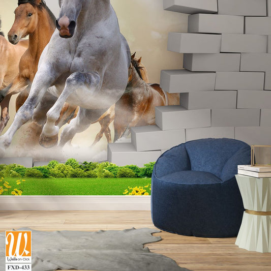 3D cute horses break through a wall Wallpaper [WP-FXD-433]