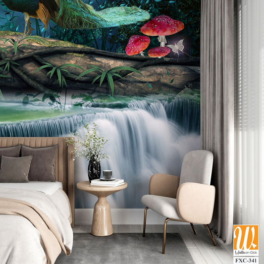 3D wallpaper fantasy background with waterfalls, peacocks, and cranes [WP-FXC-341]