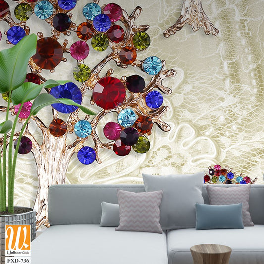 3D textured trees with colorful jewels, pearls, and deer Wallpaper [WP-FXD-736]
