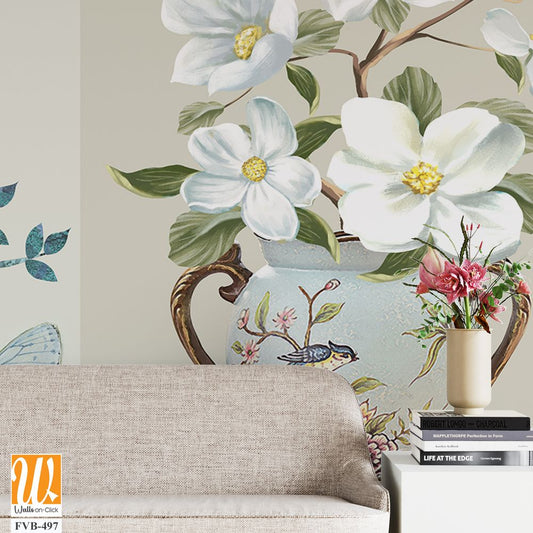 3D-panel wall art of birds, vase and butterfly Wallpaper [WP-FVB-497]