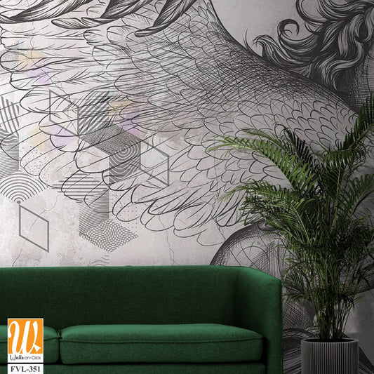 Beautiful graphic drawn pegasus with wings and geometry on a grey concrete grunge wall. Design for wallpaper, photo wallpaper, mural, card, postcard. Illustration in the loft, classic, modern style. [WP-FVL-351]