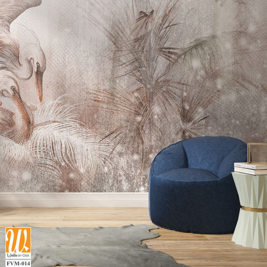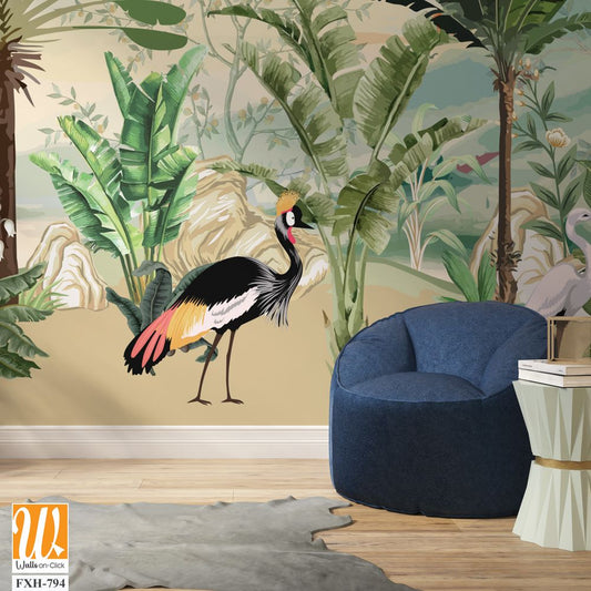 African Wild Life Mural Design for wall Painting, Tropical Wall Mural, Tropical Plam trees, Birds, Vintage waal Murals. [WP-FXH-794]