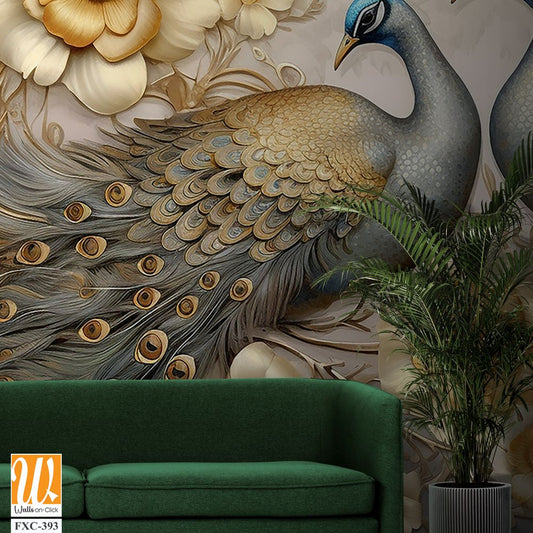 3d wallpaper, peacock birds with flowers in fantasy art style painting [WP-FXC-393]