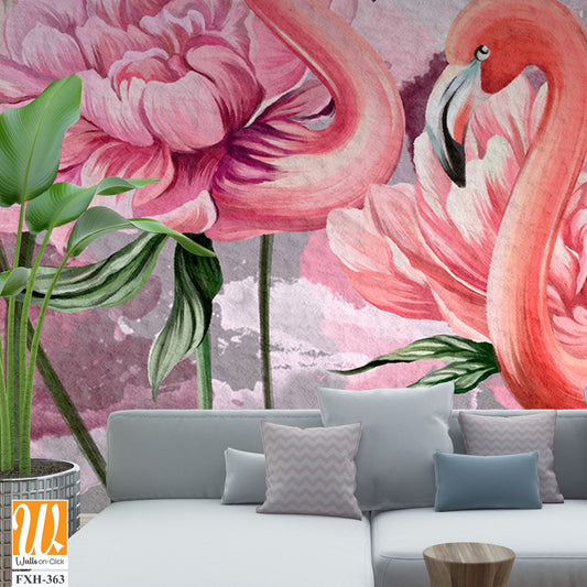 Art painted flamingo peonies with watercolor stains on textured watercolor background photo wallpaper [WP-FXH-363]