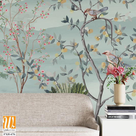 Abingdon Blush Wallpaper,Chinoiserie Mural Wallpaper, Watercolor background, Watercolor Tree and birds. [WP-FXH-676]