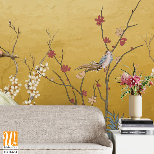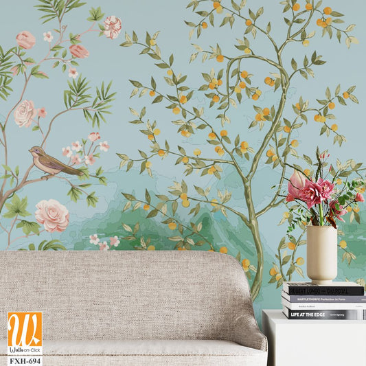 Beautiful exotic chinoiserie wallpaper. Chinese scenery landscape wallpaper. Chinoiserie, traditional oriental botanical motif. [WP-FXH-694]