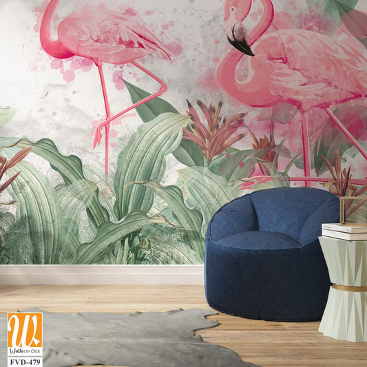Flamingos in tropical plants on a textured background in light colors in a watercolor style [WP-FVD-479]