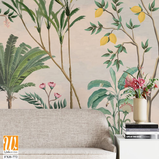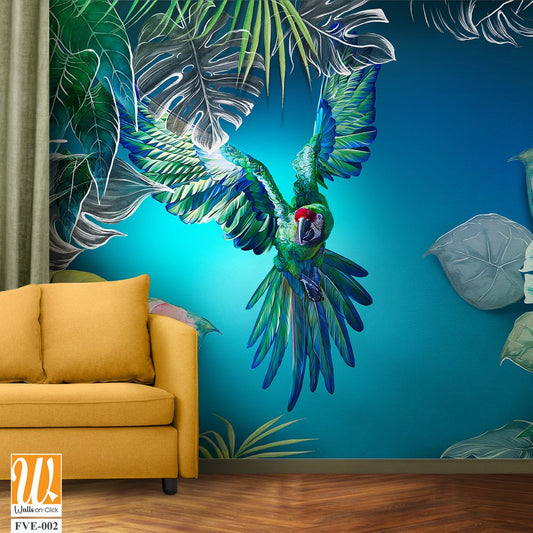 Floral Wall Mural, Tropical Plant with flower mural design, birds, Watercolor background. [WP-FXH-760]