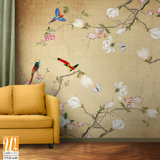 Delicate painting of magnolia flowers, colorful birds, and butterflies Wallpaper [WP-FXD-640]