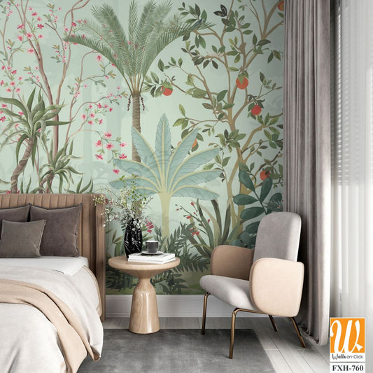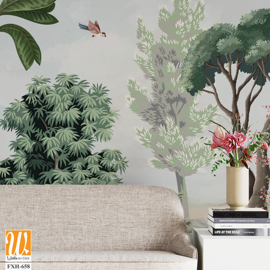 Chinoiserie Wallpaper, Garden, Jungle, animal, Beautiful Landscape, Birds, Watercolor tree. [WP-FXH-658]