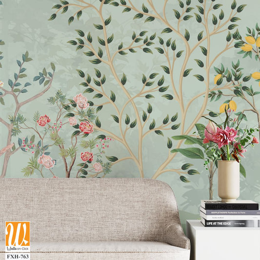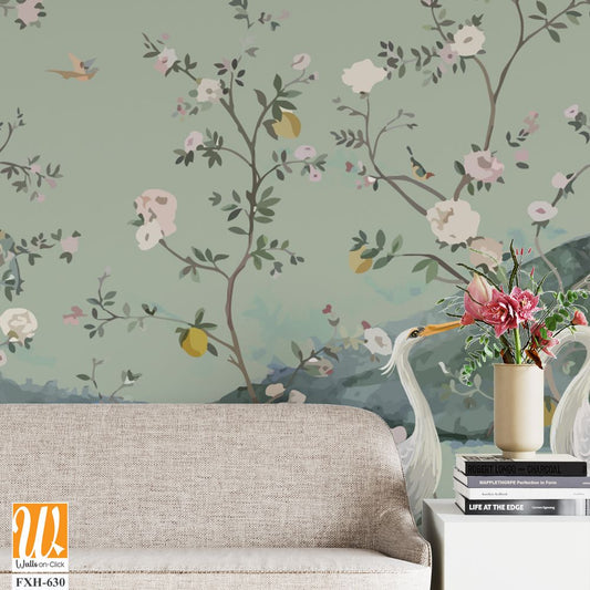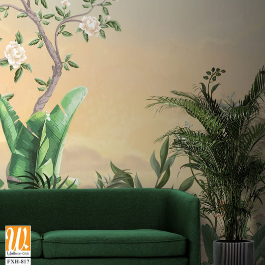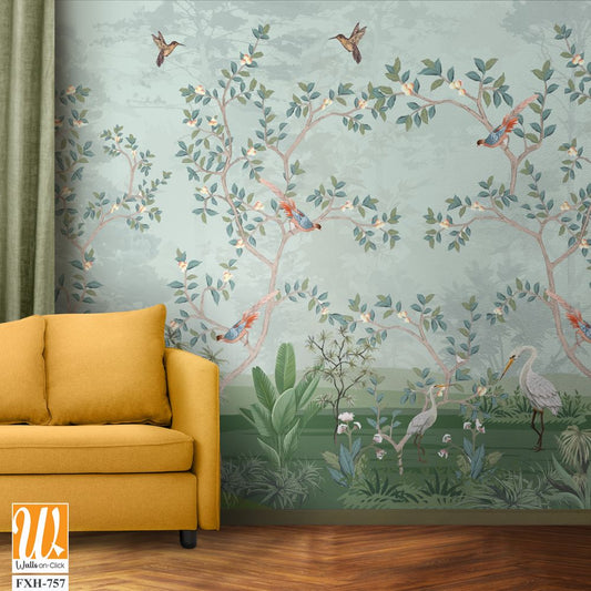 Chinoiseries Wall Mural, Watercolor Background, Birds, Tropical Tree. [WP-FXH-817]