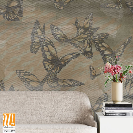 Texture background on which flying butterflies are visible, drawing in gray tones, photo wallpaper [WP-FXH-577]