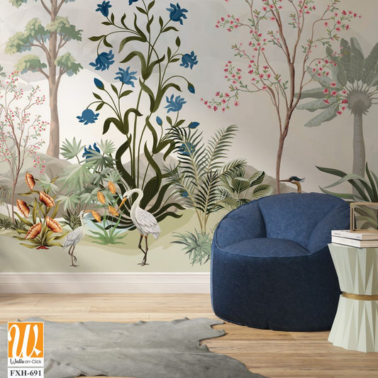Traditional Mughal Wall Mural, Tropical Plant, Birds, Watercolor background,Peacock. [WP-FXH-766]