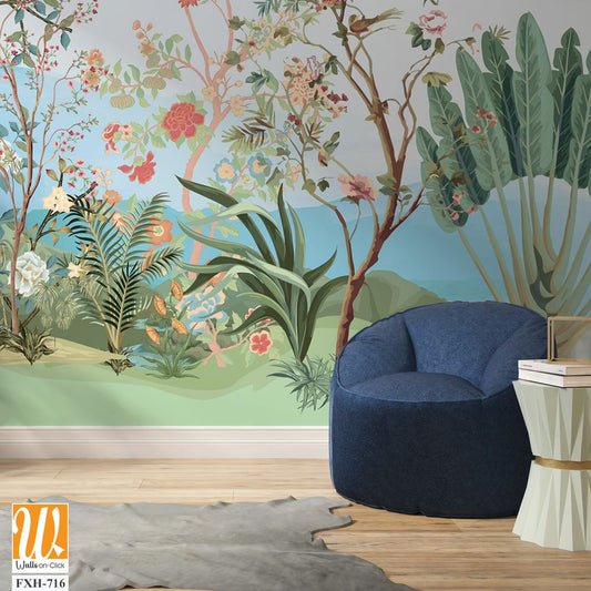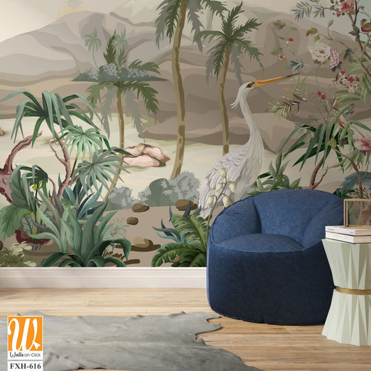 Stunning wall murals Illustration for Wall, Tropical plant with Watercolor background,Birds, Animals. [WP-FXH-773]