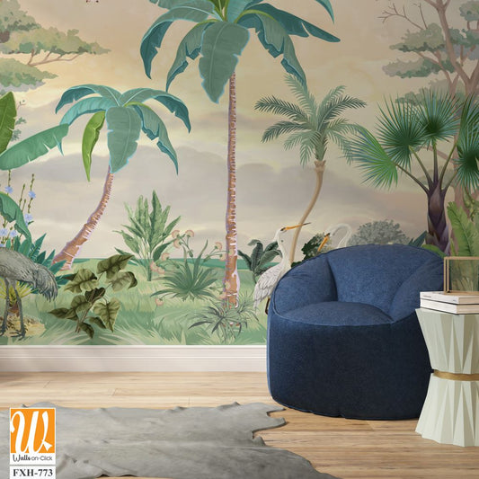 Tropical jungle wallpaper illustrations. Mural Banana tree and flamingo tropical plants for digital wallpaper. Exotic jungle wallpaper. [WP-FXH-713]