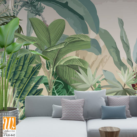 Tropical,Trees,And,Leaves,In,Foggy,Forest,Wallpaper,Design,Jungle Wallpaper Design, Tropical Plant, Watercolor Background. [WP-FXH-842]