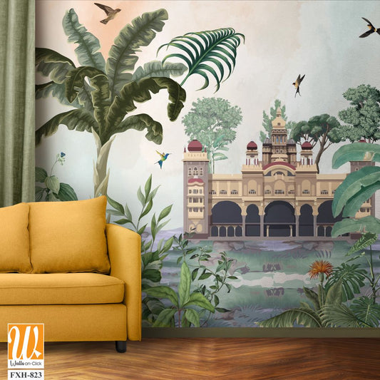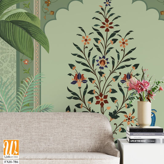 Traditional Mughal Wall Mural Wallpaper, Seamless Wallpaper Design, Mughal Arch with Flower, Peacock, Trees. [WP-FXH-786]