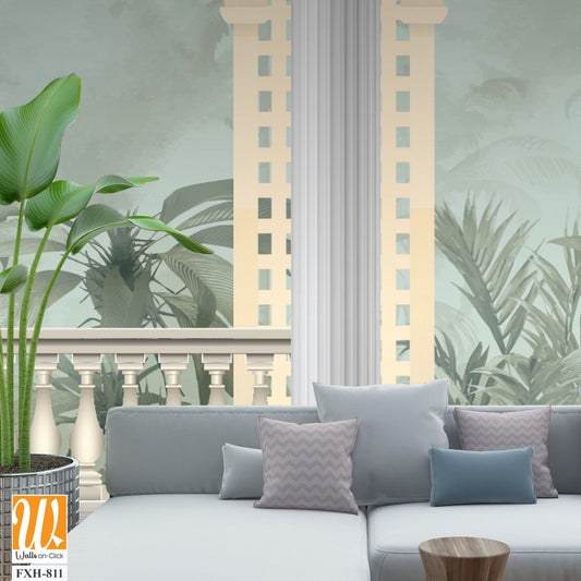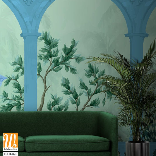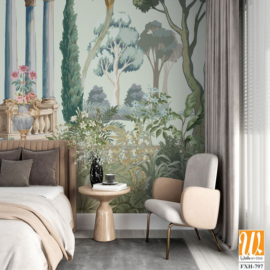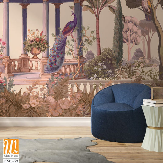 Vintage classical Roman architectural with garden, bird, botanical, peacock, illustration for wallpaper. [WP-FXH-838]