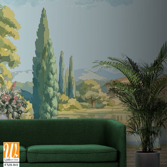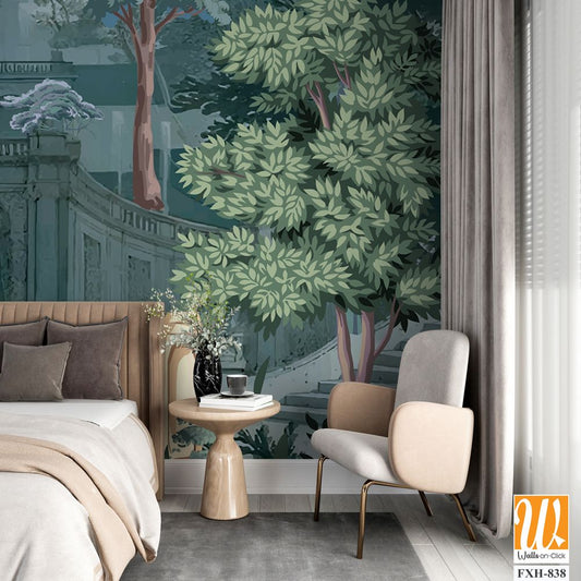 Vintage wallpaper with garden arch peacock, place landscape illustrations. Antique scenic wallpaper. [WP-FXH-820]