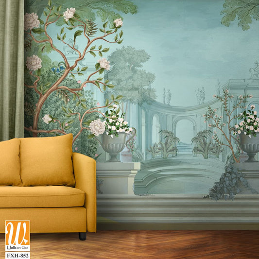 Vintage wallpaper with garden arch place. Antique scenic wallpaper. [WP-FXH-811]