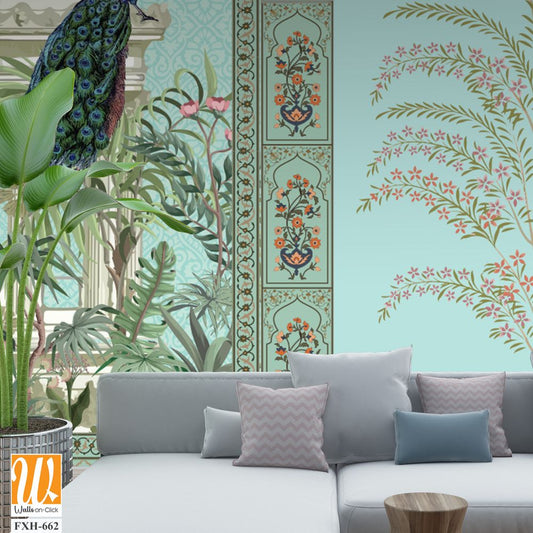Traditional Mughal Wall Mural, Mughal Arch with Mughal Flower, Peacock, Seamless Background. [WP-FXH-783]