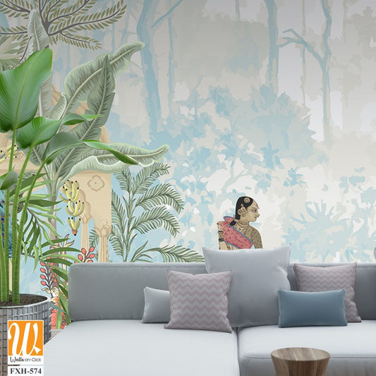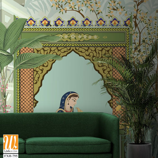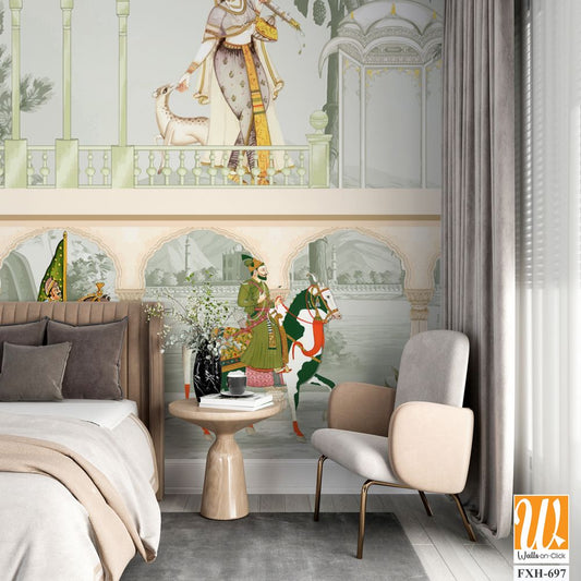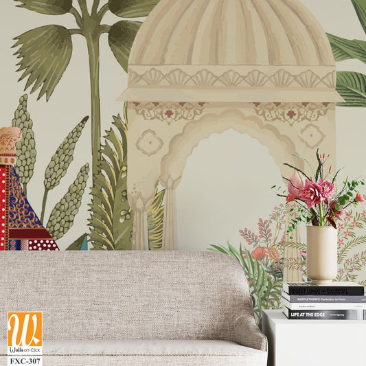 Traditional Mughal emperor riding horse, standing woman in a garden illustration pattern for wallpaper [WP-FXH-574]