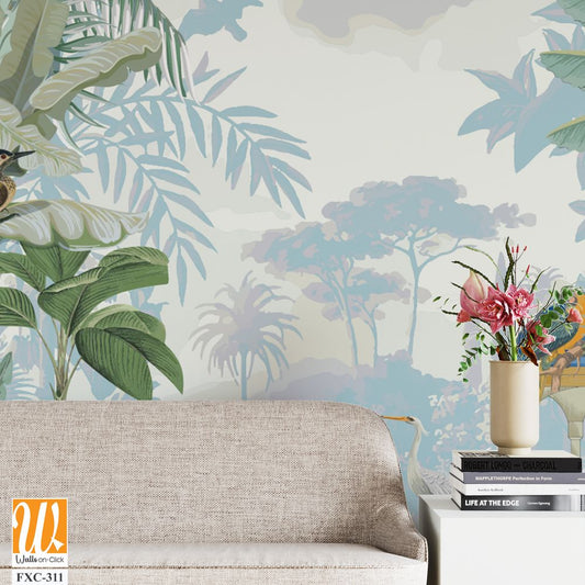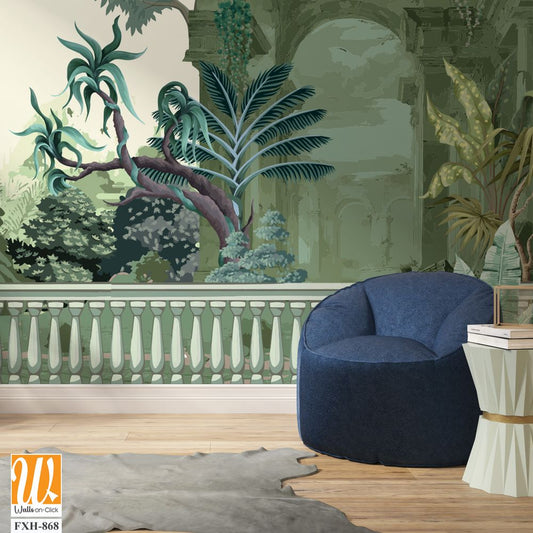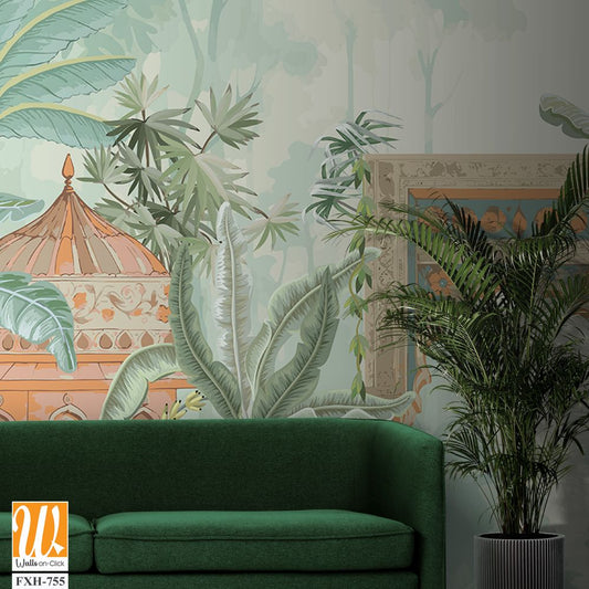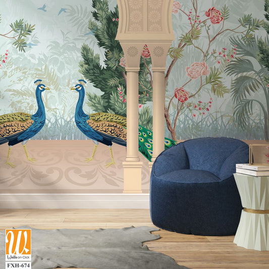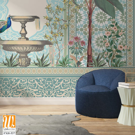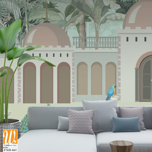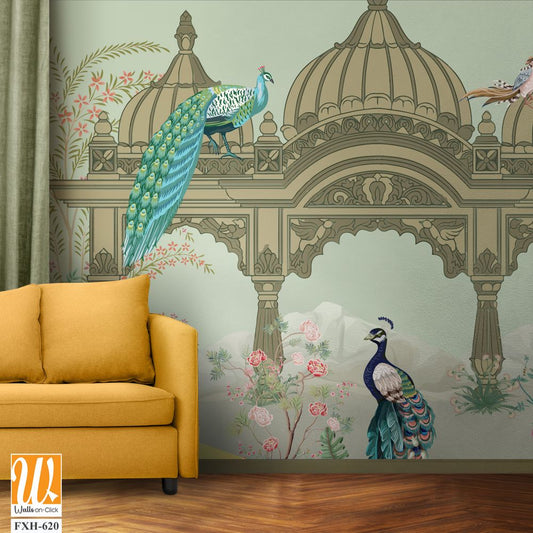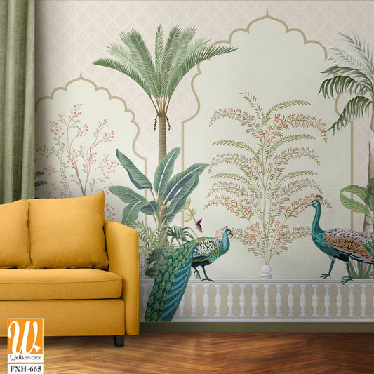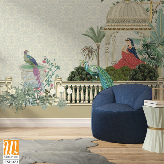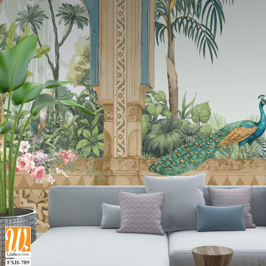 Traditional Mughal forest garden, peacock, palace illustration for wallpaper [WP-FXH-755]