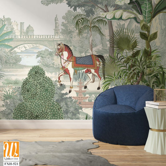 Traditional British, Mughal garden, forest, horse, parrot vector pattern [WP-FXH-521]