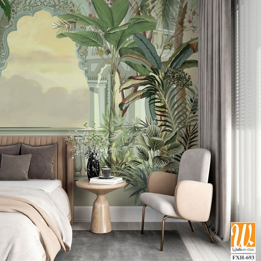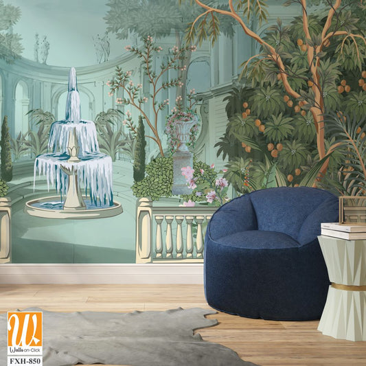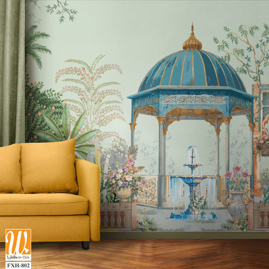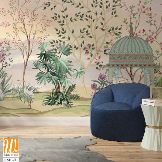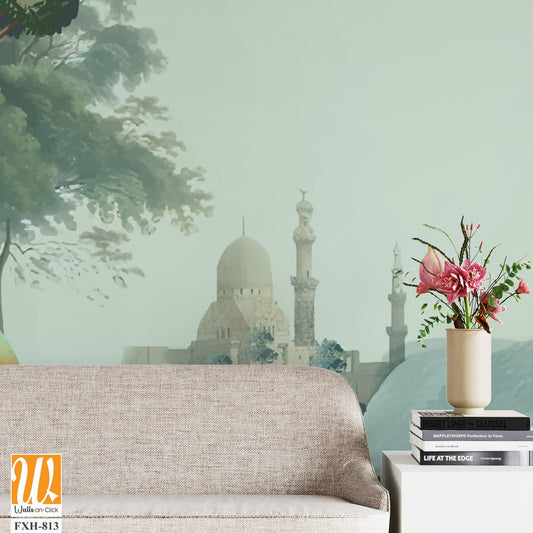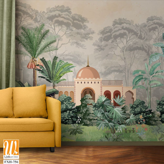 Mughal Mural Design, Mughal Wallpaper , Mughal garden with Mughal temple and watercolor tree, Watercolor background. [WP-FXH-756]