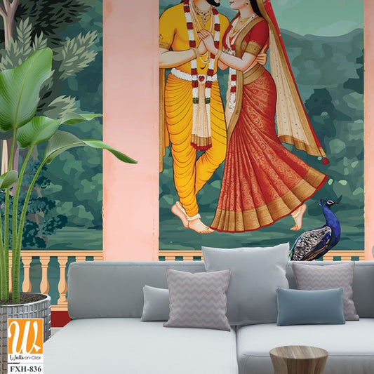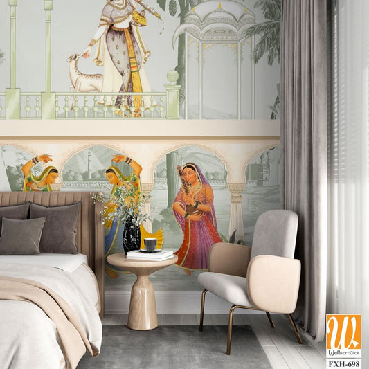 The Queen dancing Entertaining in a garden arch wallpaper illustration. India Miniature Painting Rajasthan, Udaipur illustration. Mughal mural art wallpaper. [WP-FXH-698]