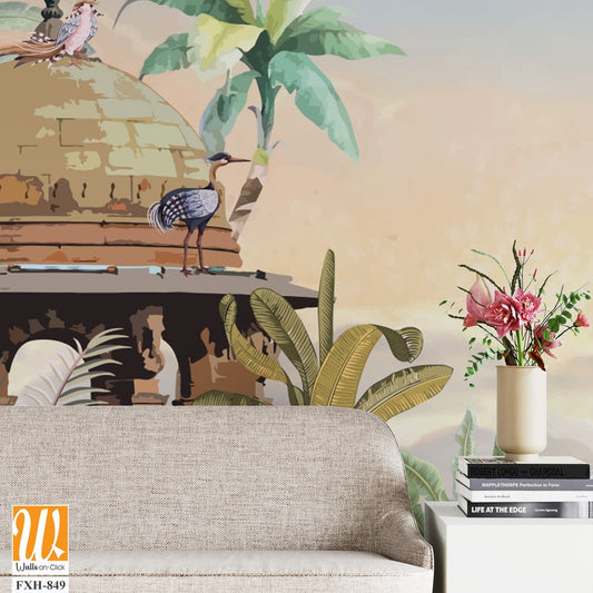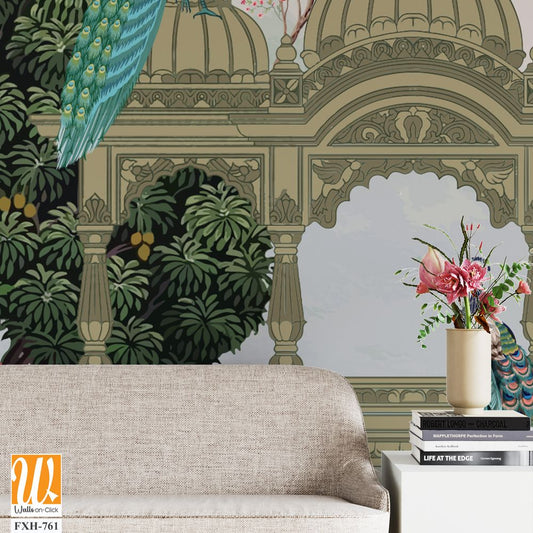 Mughal Mural Illustration, Mughal Garden, Dome, Peacock, Watercolor Background, Birds. [WP-FXH-849]