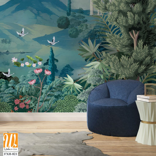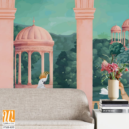 Mughal garden wallpaper mural Design, hill lake, Dome, brds, traditional mughal background, watercolor background. [WP-FXH-821]