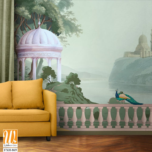 Roman ancient architecture, bird, botanical, peacock, landscape illustration for wallpaper [WP-FXH-850]
