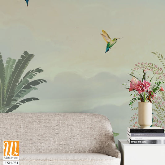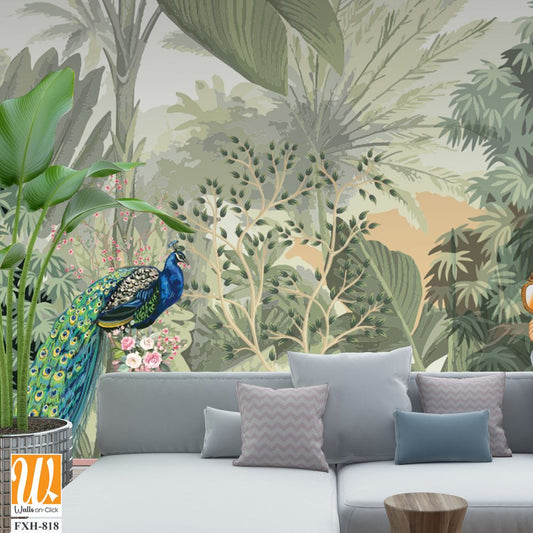 Mughal garden wallpaper, wallpaper mural design, Peacock,birds, watercolor background. [WP-FXH-731]