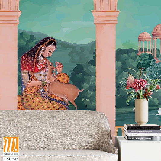 Mughal queen sitting in benefitplace, Antique scenic landscape wallpaper. Lake, Mural in the hills Vintage landscape wallpaper. [WP-FXH-813]