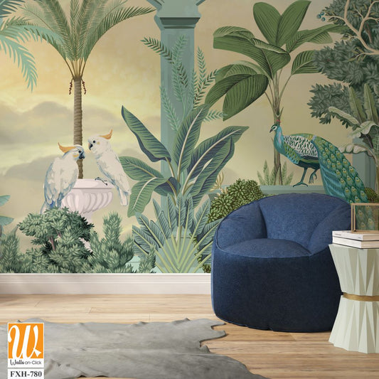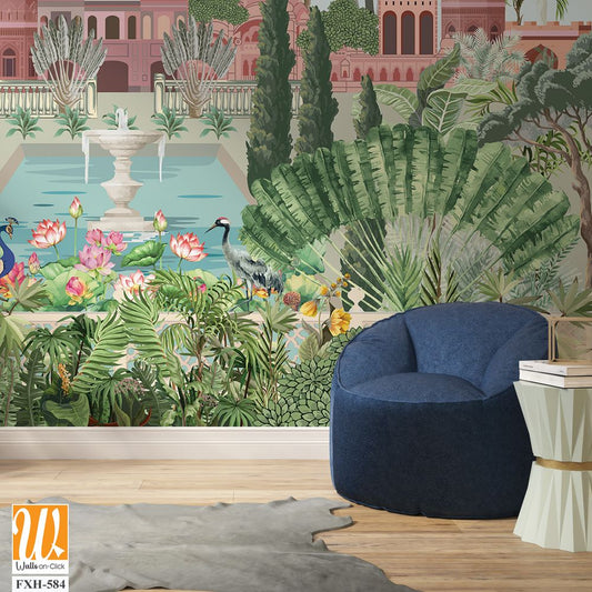 Mughal garden with bird, parrot, peacock, plants, tree, palace illustration pattern for wallpaper [WP-FXH-584]