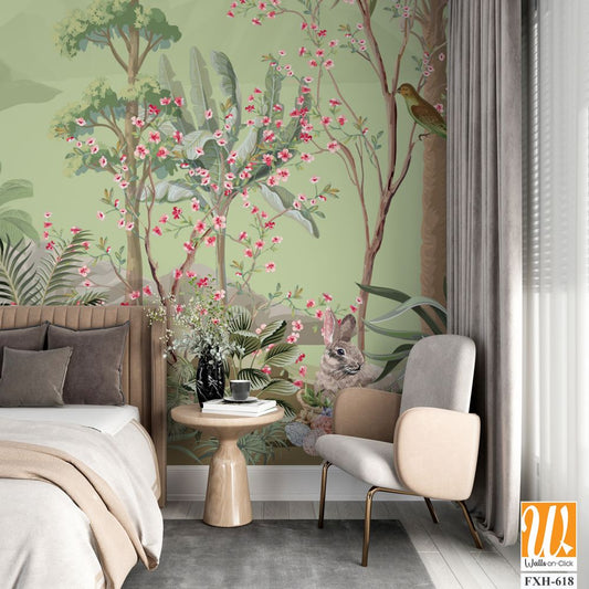 Mughal forest garden with peacock, parrot, plant and botanical tree landscape illustration pattern [WP-FXH-668]